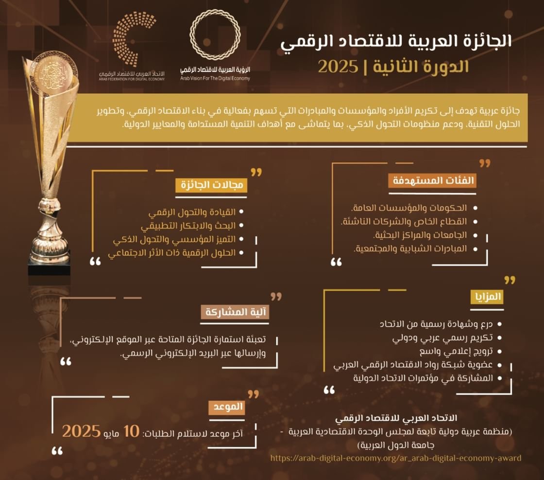 الإعلان عن الموعد النهائي للتقديم على الجائزة العربية للاقتصاد الرقمي للدورة الثانية 2025