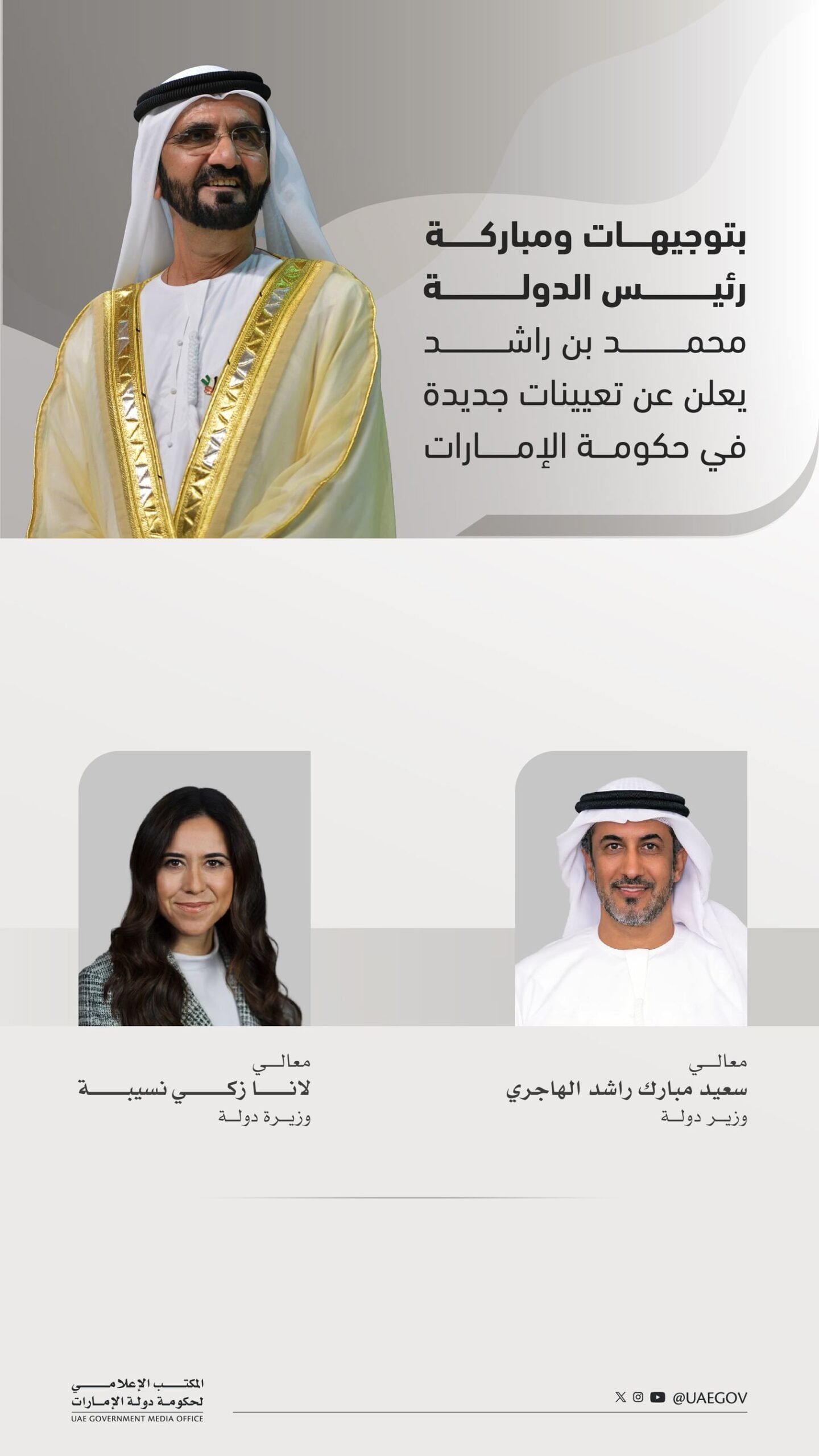 بتوجيهات ومباركة صاحب السمو الشيخ محمد بن زايد آل نهيان، رئيس الدولة “حفظه الله”، أعلن صاحب السمو الشيخ محمد بن راشد آل مكتوم، نائب رئيس الدولة، رئيس مجلس الوزراء، حاكم دبي “رعاه الله”، اليوم عن تعيينات جديدة في حكومة الإمارات، شملت كلا من معالي سعيد مبارك راشد الهاجري وزير دولة، ومعالي لانا زكي نسيبة، وزيرة دولة.