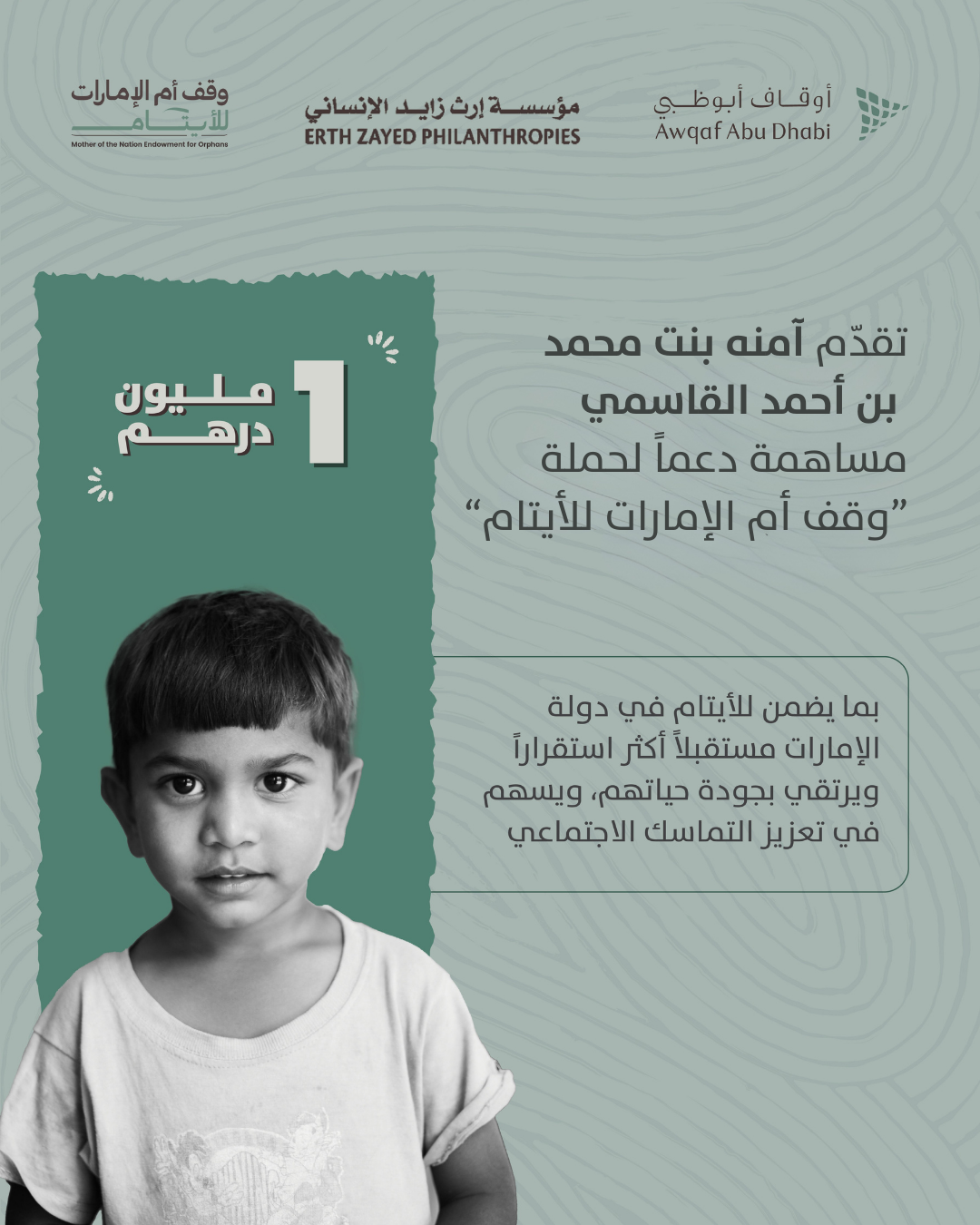 وتأتي هذه المساهمة دعماً للجهود الرامية إلى تأسيس مصدر تمويل وقفي مستدام لرعاية الأيتام في دولة الإمارات، بما يضمن لهم مستقبلاً أكثر استقراراً ويرتقي بجودة حياتهم، ويسهم في تعزيز التماسك الاجتماعي وترسيخ مفهوم الوقف كأداة تنموية مستدامة.