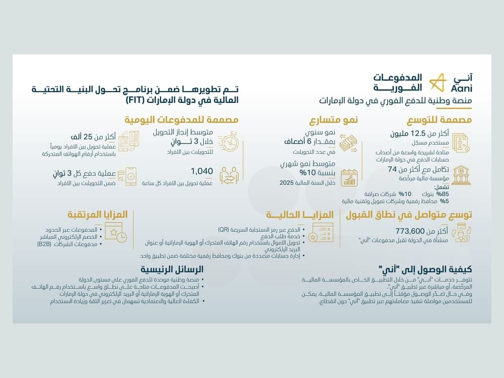 وتُبرز المؤشرات التشغيلية الأخيرة حجم الثقة المتنامية في منصة “آني”، حيث قفز عدد المستخدمين المسجلين في منصة “آني” ليتجاوز 12.5 مليون مستخدم، مستفيدين من شبكة ربط عالية الكفاءة تضم 74 مؤسسة مالية مرخصة.