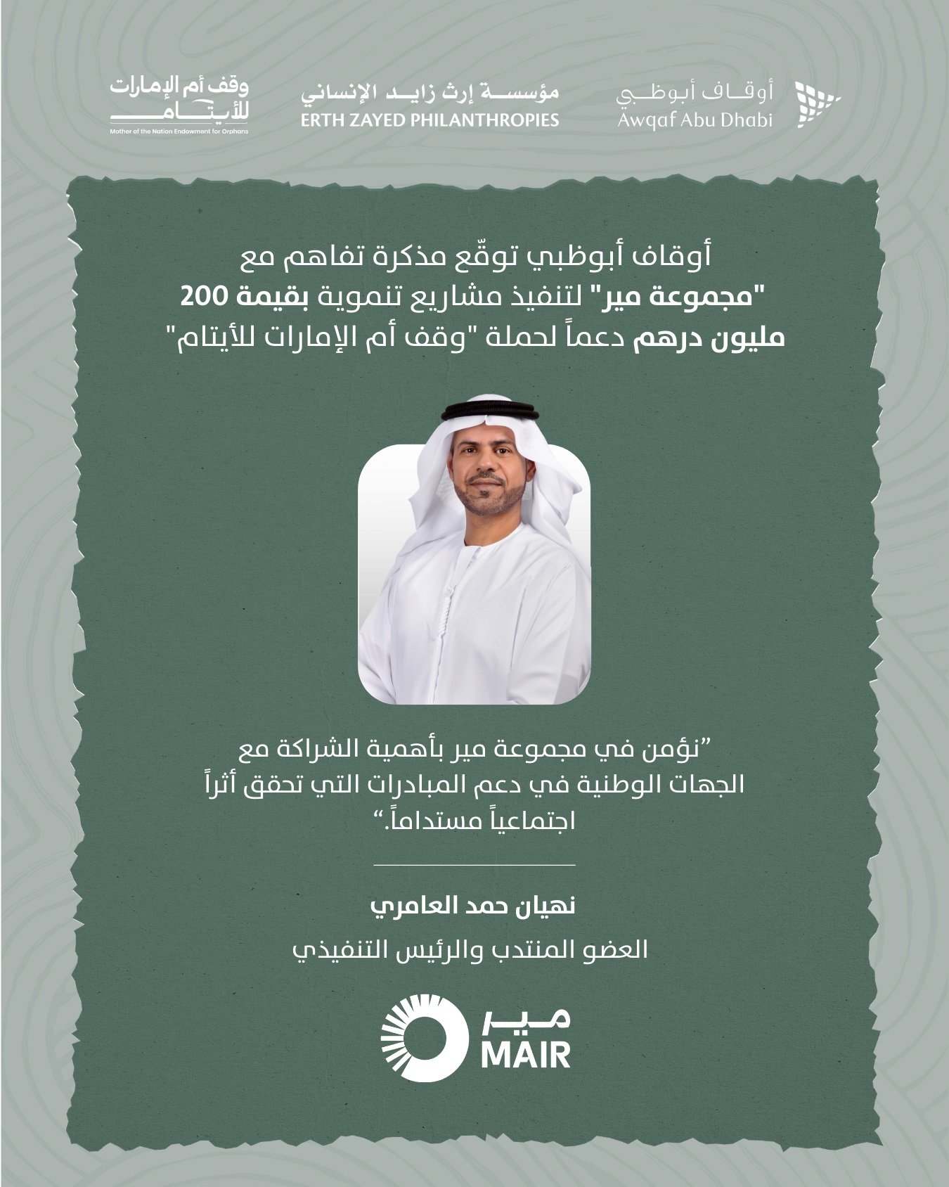 من جانبه، أكد نهيان حمد العامري، العضو المنتدب والرئيس التنفيذي لمجموعة مير، على التزام مجموعة مير بتطوير مشاريع ذات جودة عالية ومعايير تشغيلية متقدمة، بما يسهم في تحقيق عوائد مستقرة ومستدامة تدعم أهداف الوقف وتعزز مساهمة القطاع الخاص في المبادرات الوطنية ذات الأثر المجتمعي، وأضاف: “نؤمن في مجموعة مير بأهمية الشراكة مع الجهات الوطنية في دعم المبادرات التي تحقق أثراً اجتماعياً مستداماً، ونتطلع من خلال هذه المشاريع إلى المساهمة في تطوير أصول وقفية ذات قيمة اقتصادية واجتماعية، بما يضمن تحقيق عوائد طويلة الأمد تسهم في دعم حملة ’وقف أم الإمارات للأيتام‘ وتعزيز جودة حياة الأيتام”.