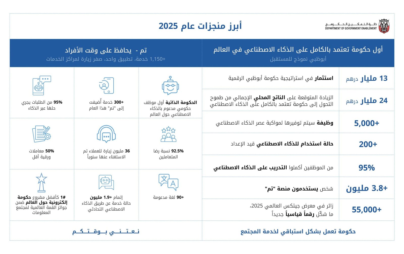 وأضاف معاليه: شكّل 2025 عاماً فارقاً، حيث نفخر بجهودنا في دائرة التمكين الحكومي بتسخير الإمكانات والتعاون مع كافة الجهات من أجل تسهيل خدمات المتعاملين والارتقاء بجودة حياة أفراد المجتمع لتأكيد مكانة أبوظبي كنموذج عالمي للحكومات التي تعتمد بالكامل على الذكاء الاصطناعي.