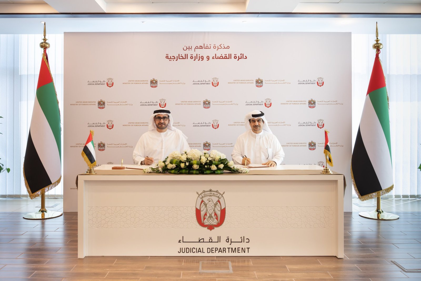 ووقّع مذكرة التفاهم كل من سعادة عمر عبيد الحصان الشامسي، وكيل وزارة الخارجية، وسعادة المستشار يوسف سعيد العبري، وكيل دائرة القضاء في أبوظبي.