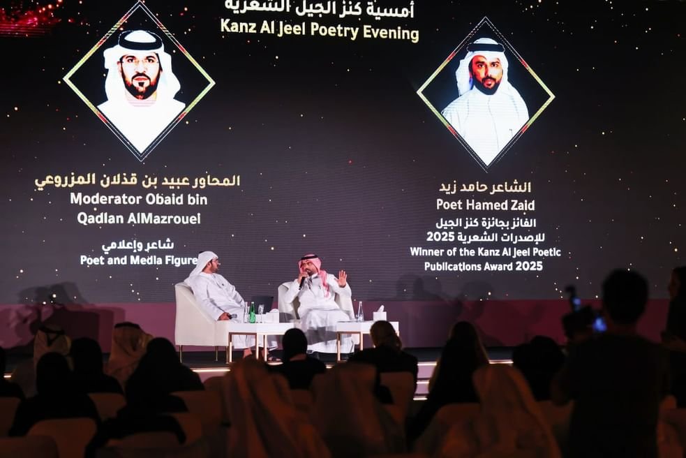 شهد قصر المويجعي، أمسية شعرية ضمن برنامج “ليالي الشعر: الكلمة المغناة”، في إطار مهرجان العين للكتاب 2025، للشاعر الكويتي حامد زيد الفائز بجائزة “كنز الجيل” عن فرع الإصدارات الشعرية عن ديوانه “وابقى جبل”؛ إذ ألهب حماس الجمهور بإلقاء قصائد وجدت طريقها إلى قلوب الحاضرين.
