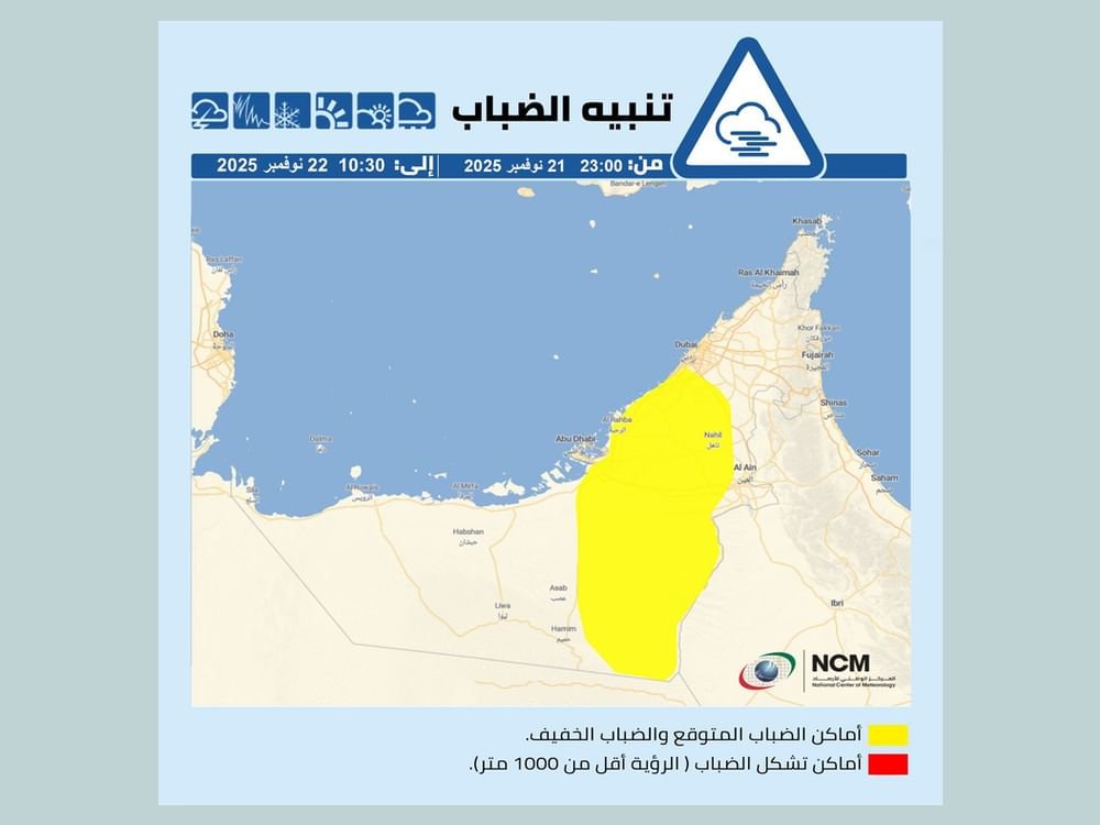 أبوظبي في 21 نوفمبر 2025 حذر المركز الوطني للأرصاد من وجود فرصة لتشكل الضباب وتدني مدى الرؤية الأفقية، وانعدامها أحياناً على بعض المناطق الساحلية والداخلية وذلك من الساعة 23:00 من مساء اليوم وحتى الساعة 10:30 من صباح الغد. وام