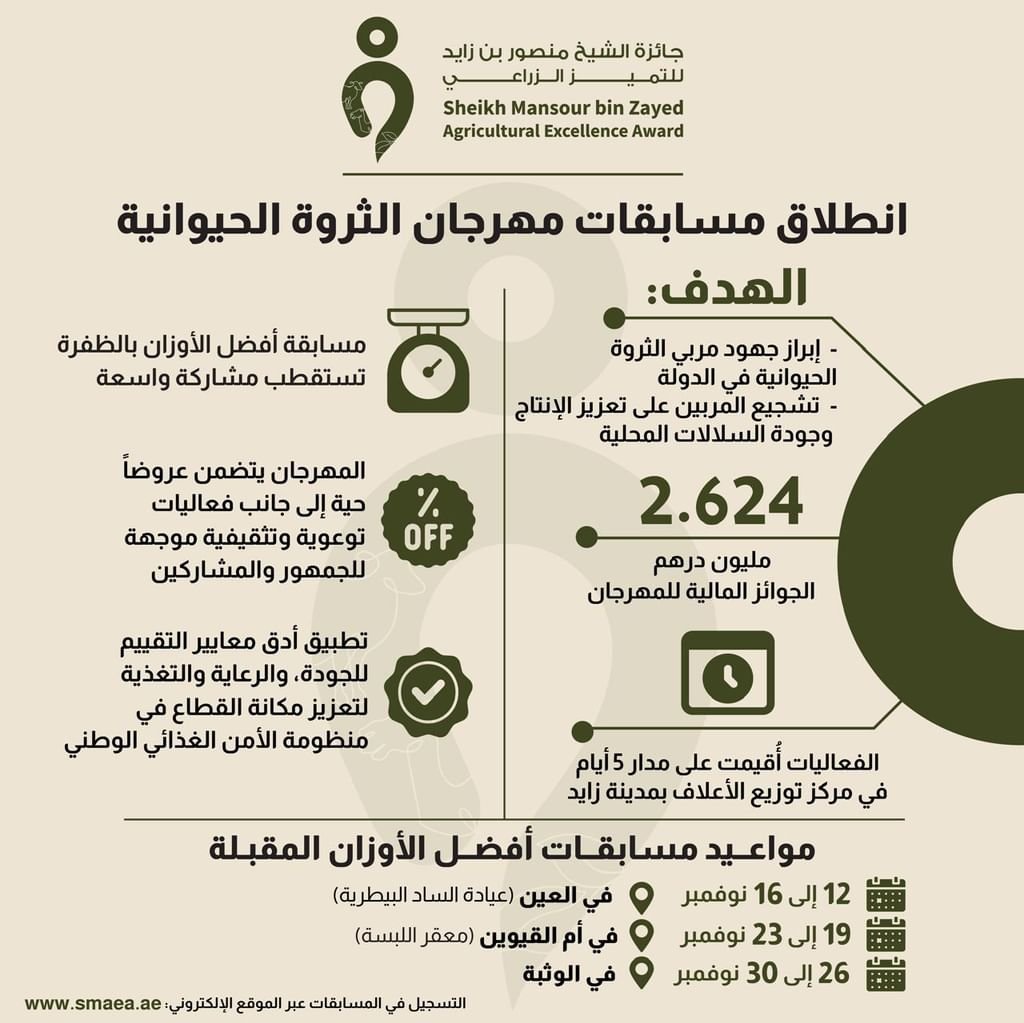 وفي إطار حرص جائزة الشيخ منصور بن زايد للتميز الزراعي على تعزيز المشاركة المجتمعية وتوسيع نطاق الفعاليات لتشمل مختلف إمارات الدولة، تُقام مسابقة أفضل الأوزان في إمارة أم القيوين خلال الفترة من 19 إلى 23 نوفمبر، وذلك في معقر اللبسة بمنطقة اللبسة، حيث تُعد هذه الفعالية محطة مهمة لإشراك مربي الثروة الحيوانية في مختلف مناطق الدولة، وإبراز جهودهم في تحسين جودة السلالات وتعزيز الإنتاج الحيواني المحلي.