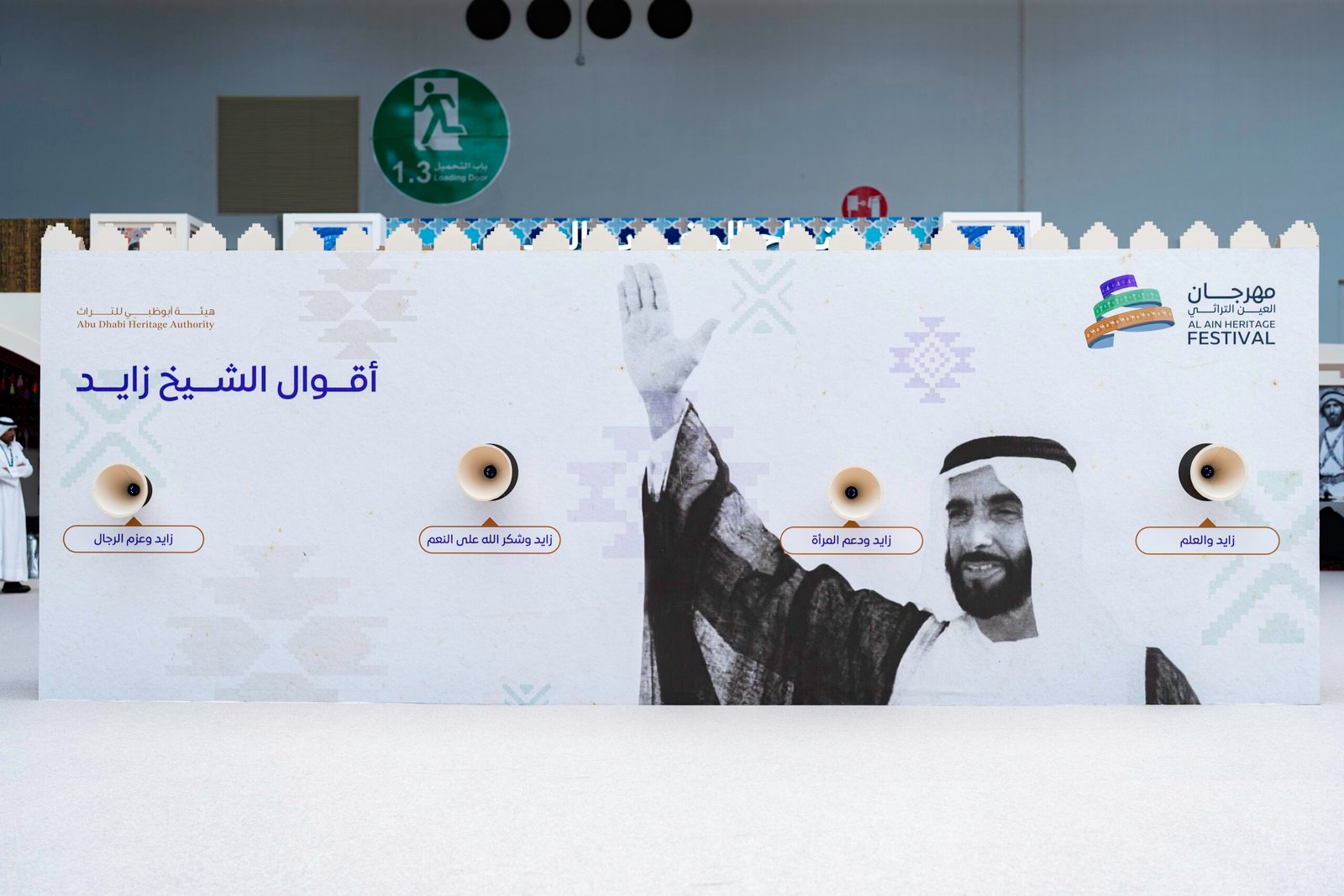 على الجدار تتوزع أبواق صغيرة ذات تصميم بسيط مستوحى من أدوات الماضي، وكأنها جزء من المشهد التراثي نفسه، تستجيب للزائر حين يقترب منها ليستمع، فيخرج صوت الشيخ زايد “رحمه الله”، واضحاً، هادئاً، صادقاً مثلما عرفه الناس، وتعلموا معاني كلماته.