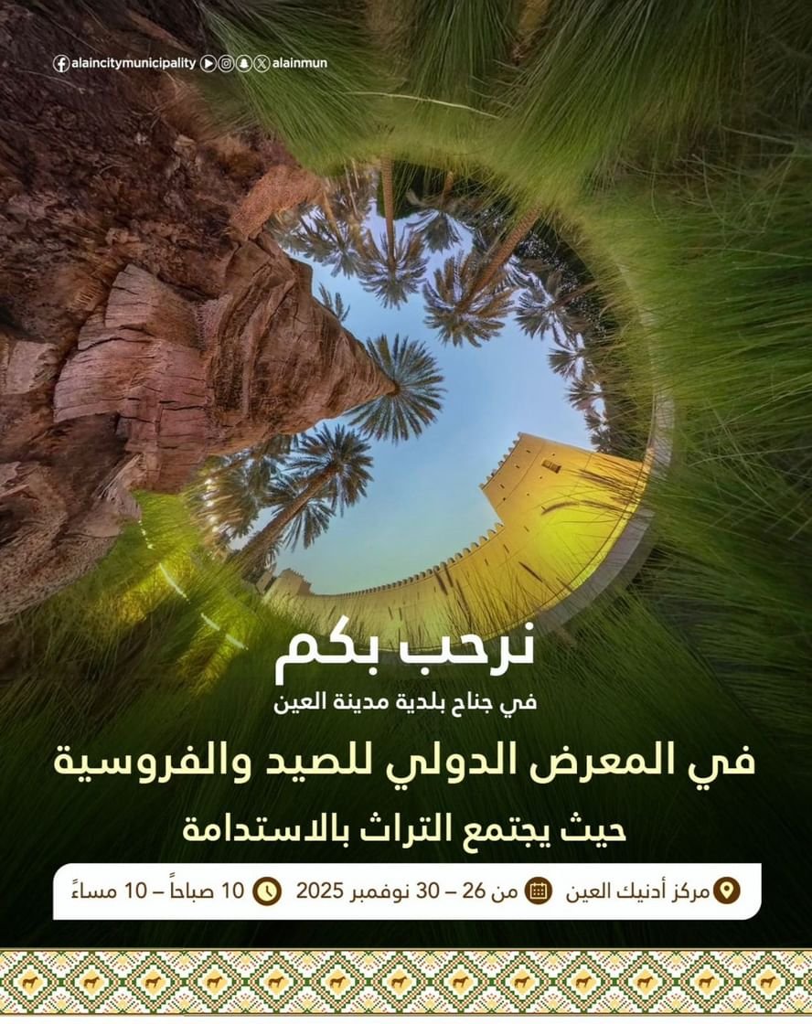 تشارك بلدية مدينة العين في المعرض الدولي للصيد والفروسية، الذي يُقام تحت رعاية سمو الشيخ هزاع بن زايد آل نهيان، ممثل الحاكم في منطقة العين، خلال الفترة من 26 إلى 30 نوفمبر الجاري، وذلك عبر جناح متكامل يجسّد جهودها في حماية الإرث الثقافي والبيئي للمدينة.
