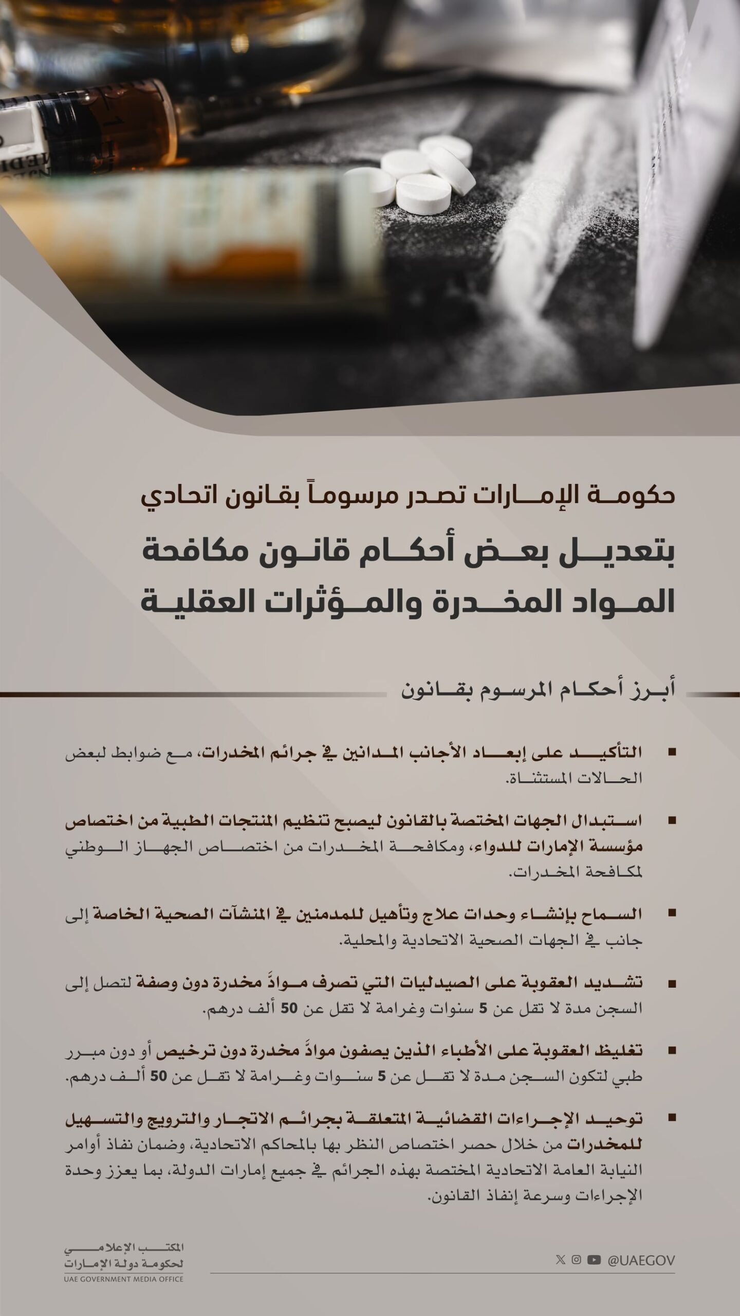 حكومة الإمارات تصدر مرسوماً بقانون اتحادي بتعديل بعض أحكام قانون مكافحة المواد المخدرة والمؤثرات العقلية