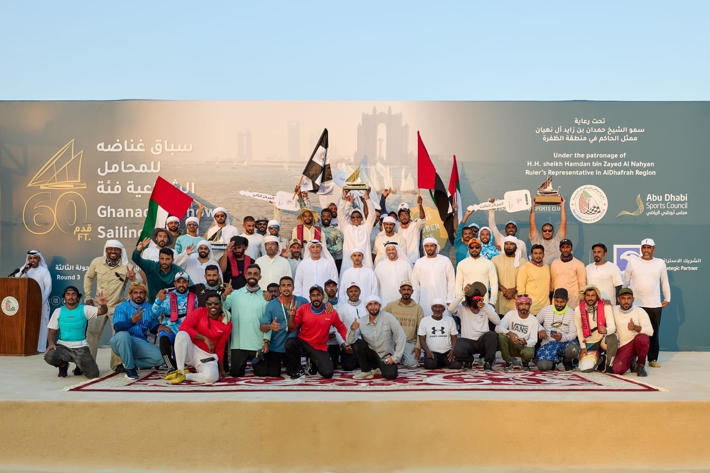 وكرم الفائزين بالمراكز الثلاثة الأولى مبارك المحيربي نائب المدير العام للشؤون الإدارية وإدارة المجتمع – شركة بترول أبوظبي الوطنية “أدنوك”، وعلي سالمين الظاهري، ممثل مجلس أبوظبي الرياضي، وخليفة الرميثي مدير إدارة السباقات التراثية بنادي أبوظبي للرياضات البحرية، وخليفة السويدي مدير أكاديمية أبوظبي للرياضات البحرية.