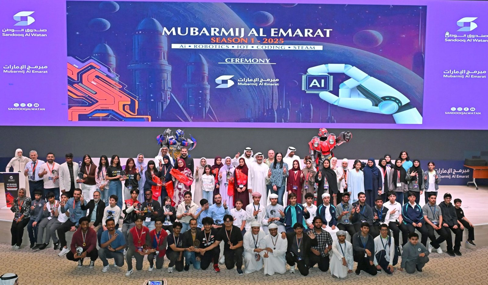 وكرم سعادة ياسر القرقاوي مدير عام صندوق الوطن، أعضاء 38 فريقًا فائزًا بجوائز تشمل: جائزة البطل، والابتكار، والتميز التقني، والاستدامة، وأفضل عرض تقديمي، وجوائز متخصصة مثل جائزة التميز في الذكاء الاصطناعي للأشياء، وجائزة سرد القصة الهندسية، حيث اجتازوا جميعا المرحلة النهائية للمسابقة التي بدأت أنشطتها في وقت مبكر من هذا العام لإتاحة الفرصة أمام كافة طلاب المدارس الحكومية والخاصة بكافة إمارات الدولة، بهدف تمكين أبناء وبنات الإمارات من طلبة المدارس من إطلاق قدراتهم في مجالات التقنية الحديثة في البرمجة والروبوت.