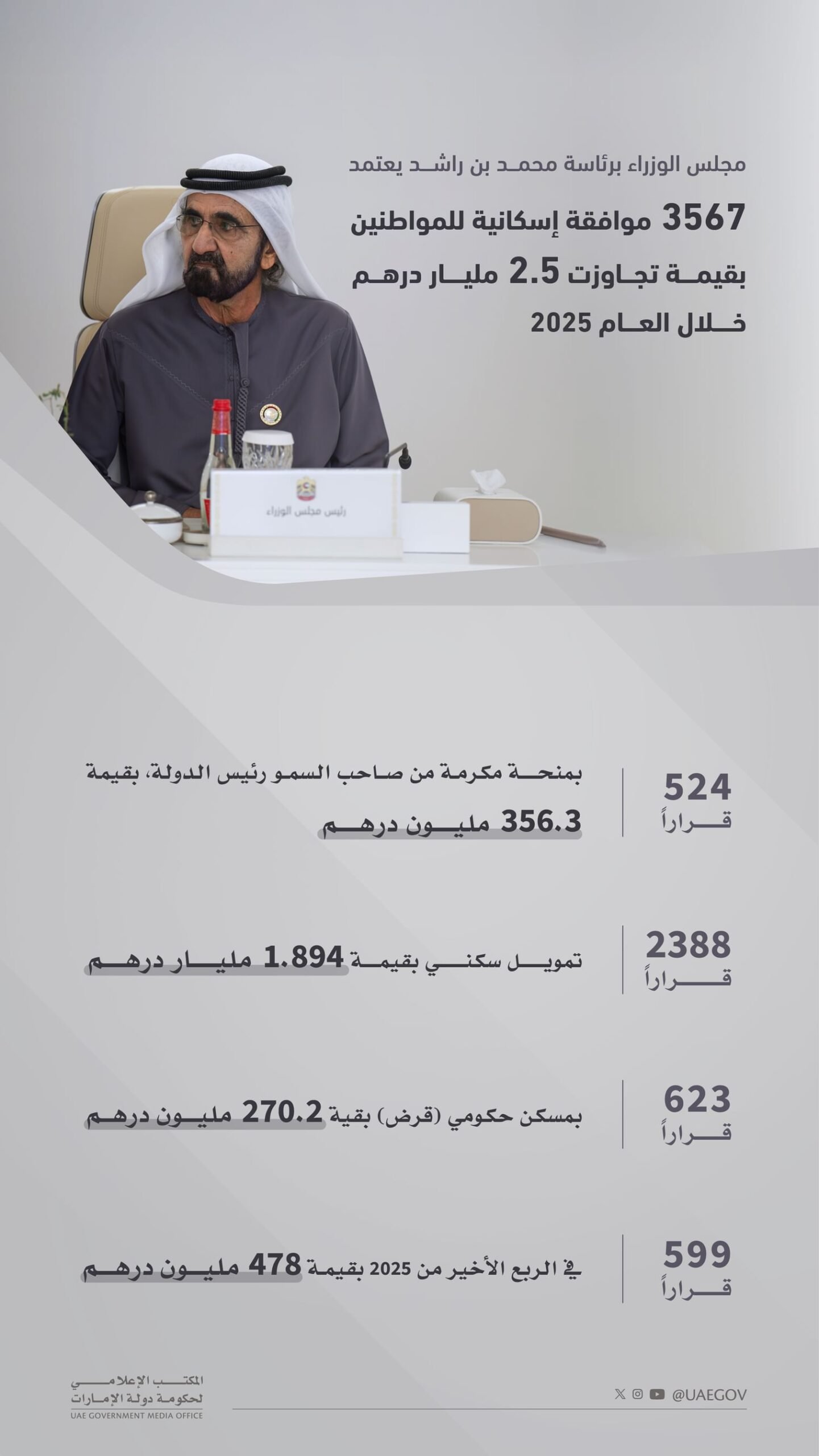 اعتمد مجلس الوزراء برئاسة صاحب السمو الشيخ محمد بن راشد آل مكتوم، نائب رئيس الدولة، رئيس مجلس الوزراء، حاكم دبي -رعاه الله- 3567 موافقة إسكانية للمواطنين بإجمالي 2 مليار و 546 مليون درهم خلال العام 2025 ، منها 599 موافقة جديدة في الربع الأخير من العام الجاري بقيمة 478 مليون درهم.