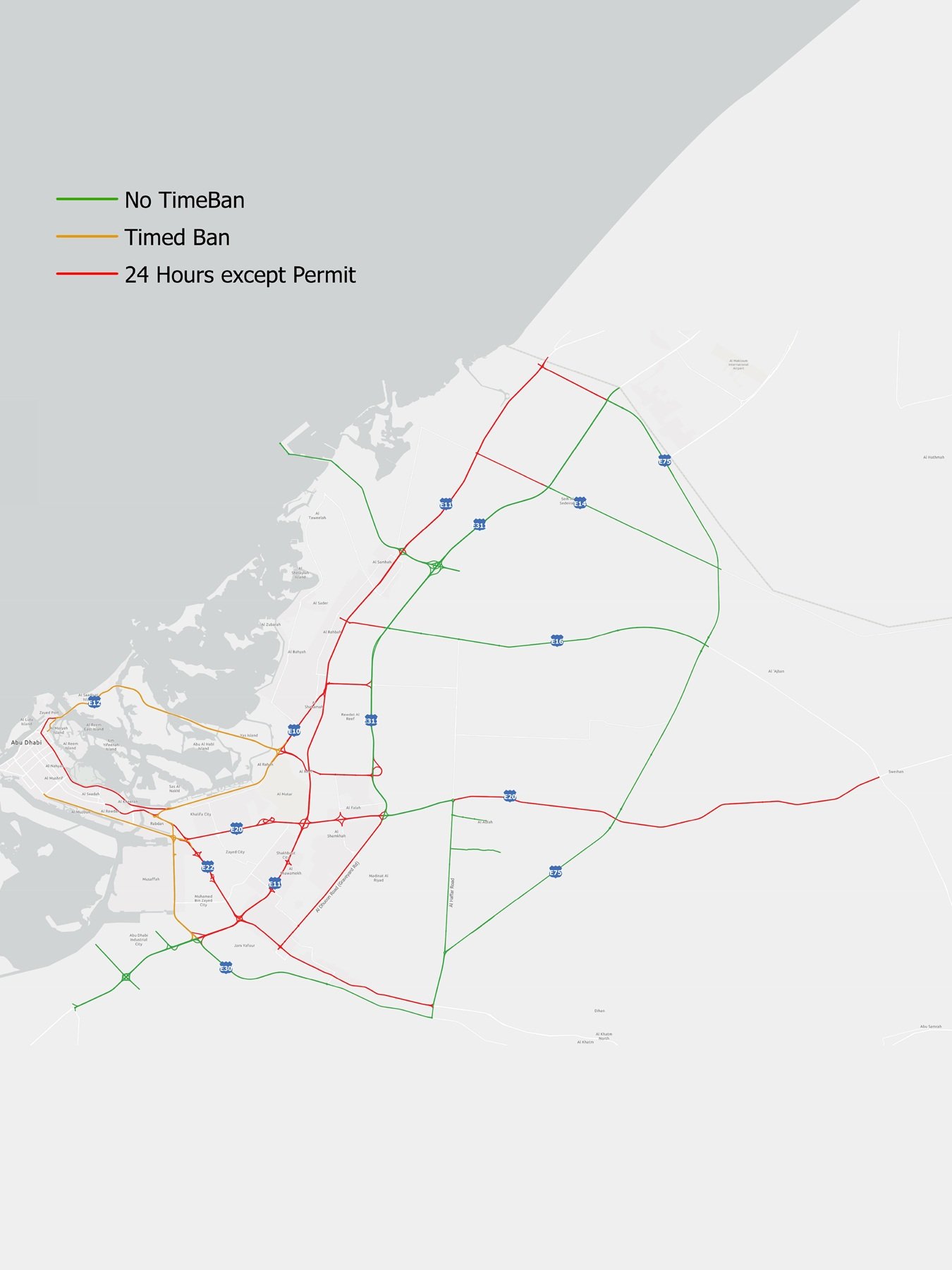 كما أفاد المركز أنه سيتم منع حركة الشاحنات من استخدام طريق الروضة (E30) في منطقة مصفح الصناعية وذلك من مجمع الجسور وحتى تقاطع طريق الشيخ خليفة بن زايد الدولي خلال فترتي الذروة الصباحية والمسائية واستخدام المسار البديل عبر جسر أيكاد، بما يحد من التداخل مع المركبات الخفيفة ويعزز انسيابية الحركة المرورية في المنطقة.