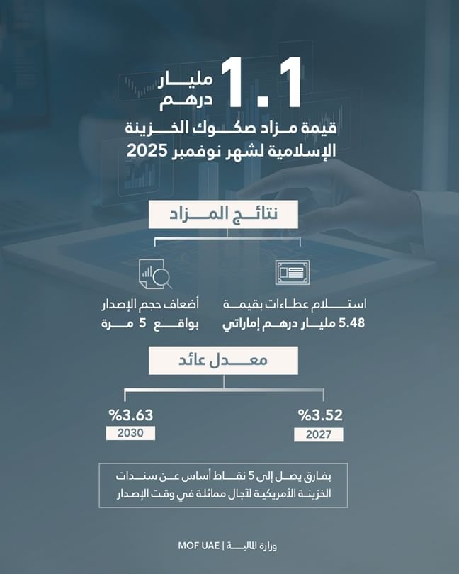 أعلنت وزارة المالية بصفتها الجهة المُصدرة، وبالتعاون مع مصرف الإمارات العربية المتحدة المركزي بصفته وكيل الإصدار والدفع، عن نجاح مزاد صكوك الخزينة الإسلامية “T-Sukuk” المقوّمة بالدرهم الإماراتي، لشهر نوفمبر بقيمة إجمالية بلغت 1.1 مليار درهم، وذلك ضمن برنامج صكوك الخزينة الإسلامية لعام 2025 كما تم نشره على الموقع الرسمي للوزارة.