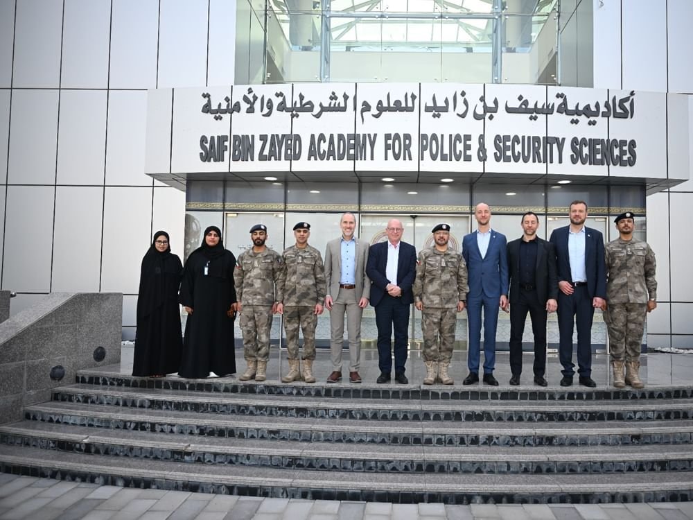 واستقبل العميد الدكتور راشد محمد بورشيد مدير أكاديمية سيف بن زايد للعلوم الشرطية والأمنية الوفد، واطلعه على منظومة التدريب والتأهيل المعتمدة، وتم بحث سبل التنسيق والتعاون في مجالات العمل الشرطي والأمني، وتبادل المعارف العلمية والتخصصية، وإجراء المقارنات المعيارية لأفضل الممارسات والخدمات التطويرية، إلى جانب التعرف على الدور الريادي للأكاديمية في توظيف أحدث التقنيات المعاصرة في التدريب الشرطي والأمني الحديث وفقًا لأفضل المعايير والممارسات العالمية.