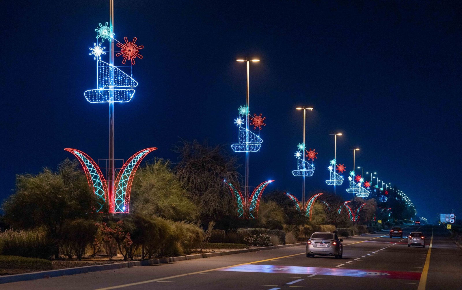 وشملت الأعمال تزيين الطرق الرئيسية والمداخل العامة، إضافة إلى تركيب مجسمات وطنية وتصاميم ضوئية تحمل رموز الهوية الإماراتية ومظاهر الفخر والانتماء، وذلك بهدف تعزيز قيم الفخز والعز والولاء لوطننا الغالي ولقيادتنا الرشيدة ونشر السعادة بين أفراد المجتمع وإضفاء لمسة جمالية على شوارع مدن المنطقة.