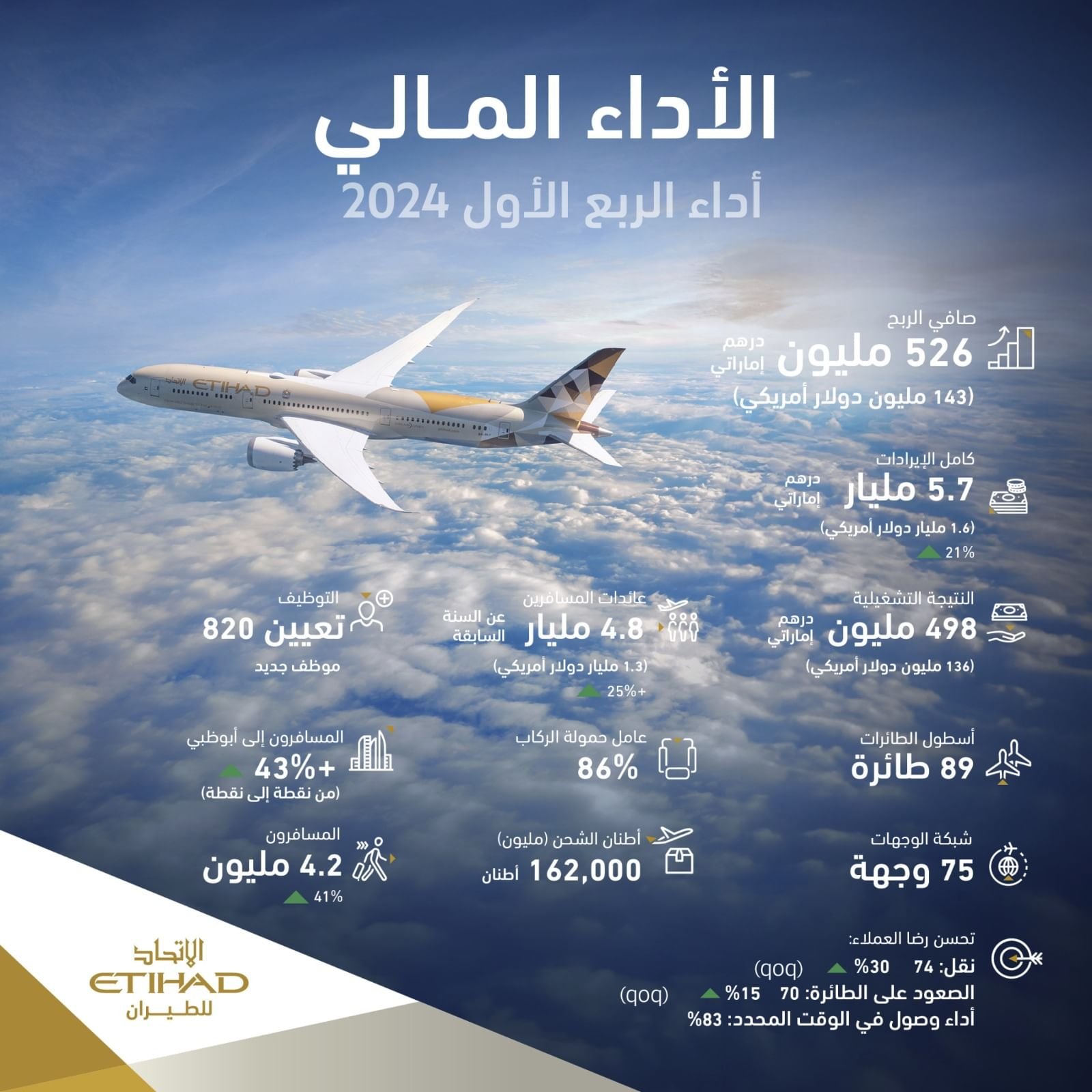 أعلنت الاتحاد للطيران اليوم عن نتائج الربع الأول لعام 2024، حيث سجلت صافي أرباح بعد الضريبة قدره 526 مليون درهم، في تحسن كبير عن الربع الأول لعام 2023، ويشير إلى بداية قوية للسنة المالية 2024.
