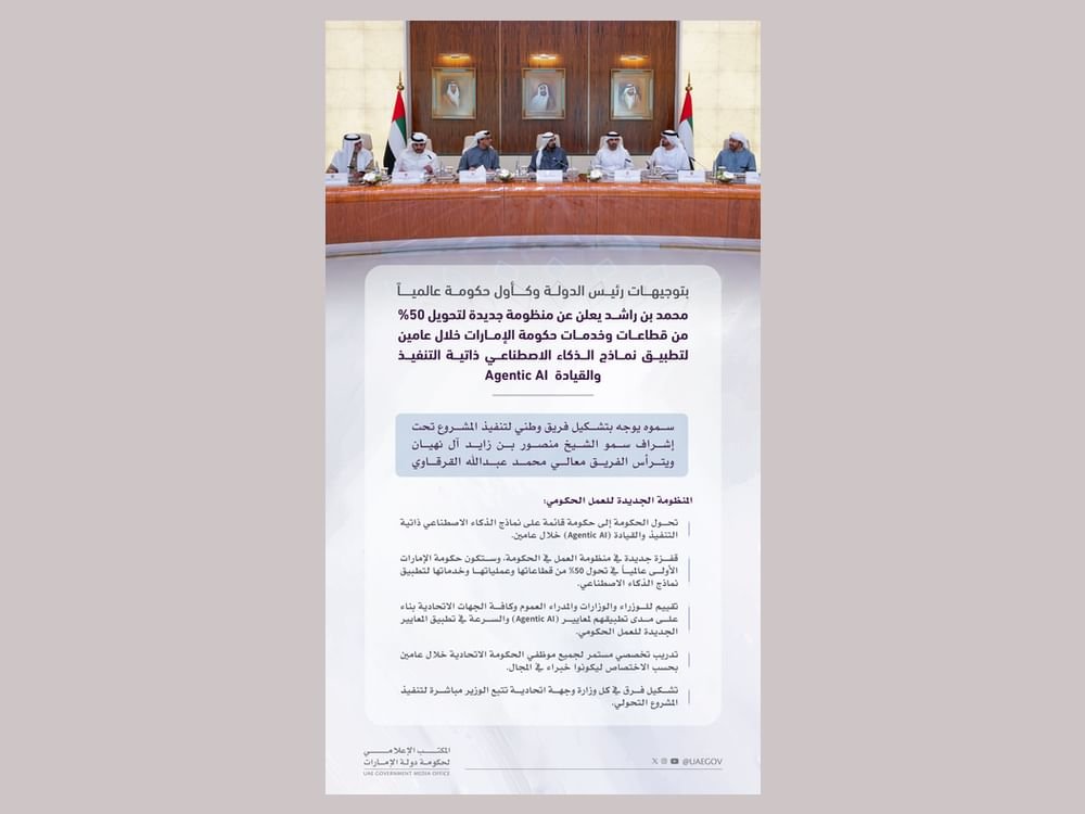 بتوجيهات رئيس الدولة وكأول حكومة عالمياً/محمد بن راشد يعلن عن منظومة جديدة لتحويل 50% من قطاعات وخدمات حكومة الإمارات خلال عامين لتطبيق نماذج الذكاء الاصطناعي ذاتية التنفيذ والقيادة Agentic AI