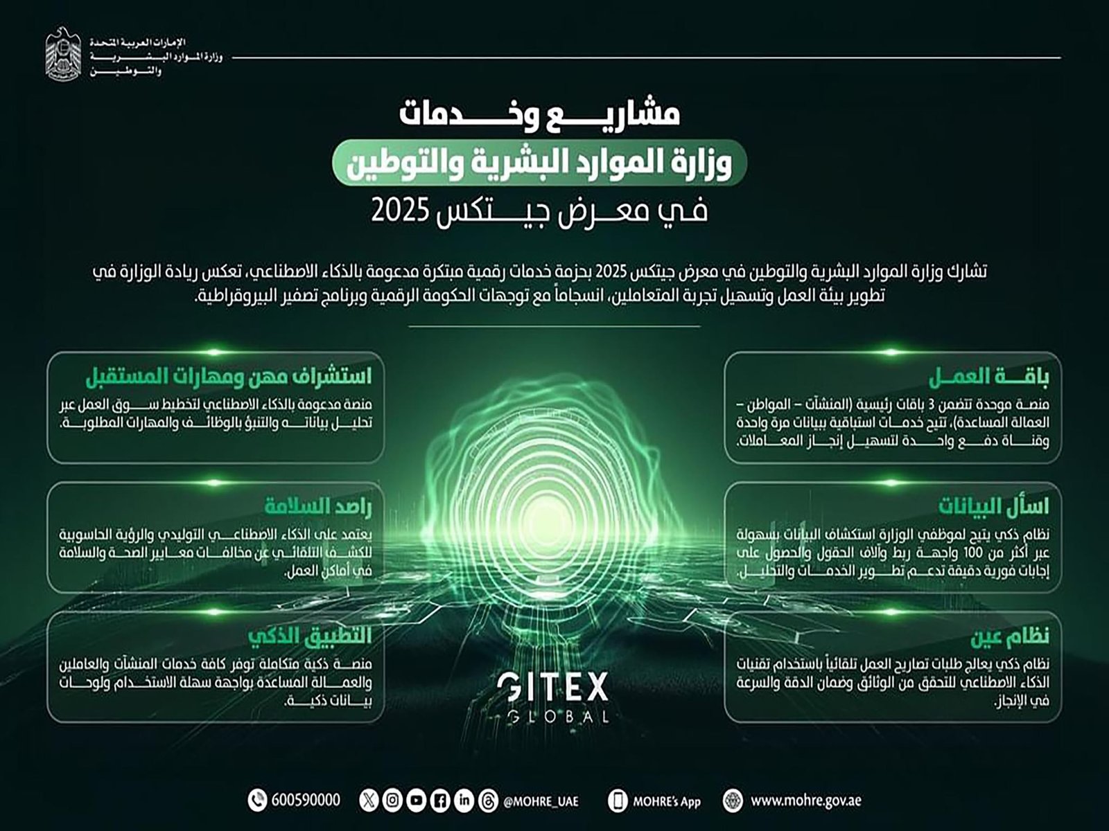 تشارك وزارة الموارد البشرية والتوطين في معرض جيتكس جلوبال 2025 بمجموعة من المشاريع والخدمات الرقمية المتقدمة المدعومة بالذكاء الاصطناعي بما يعكس التزامها بتعزيز بيئة العمل وتسهيل تجربة المتعاملين انسجاما مع توجهات الحكومة الرقمية وبرنامج تصفير البيروقراطية.