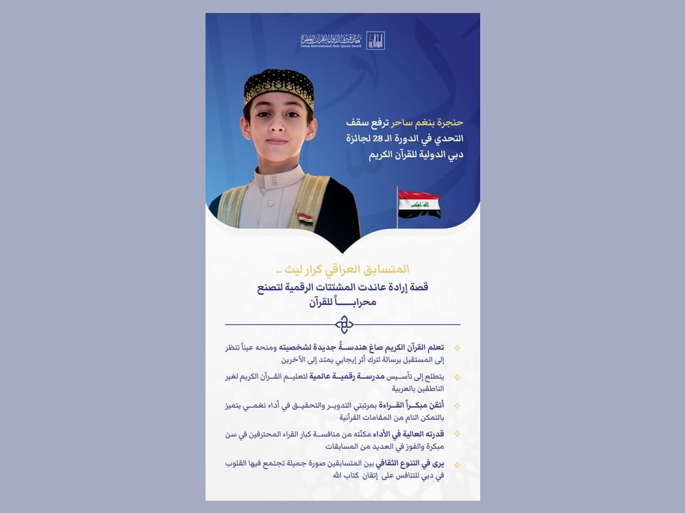 الموهبة العراقية كرار ليث تتأهل لنهائيات جائزة دبي الدولية للقرآن الكريم 2026