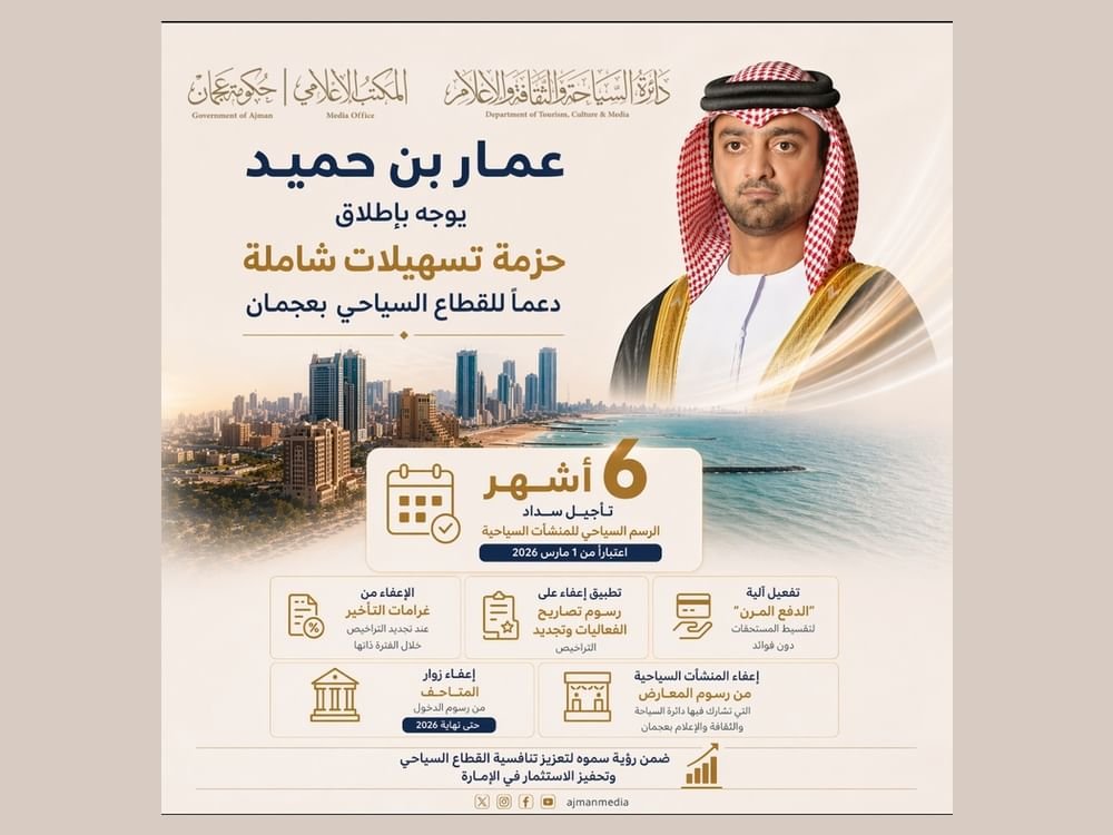عجمان في 23 أبريل 2026  بتوجيهات سمو الشيخ عمار بن حميد النعيمي، ولي عهد إمارة عجمان رئيس المجلس التنفيذي، أعلنت دائرة السياحة والثقافة والإعلام في عجمان عن إطلاق حزمة من التسهيلات الهادفة إلى دعم الأنشطة السياحية، وجذب الاستثمارات، وتعزيز تنافسية القطاع السياحي في الإمارة.