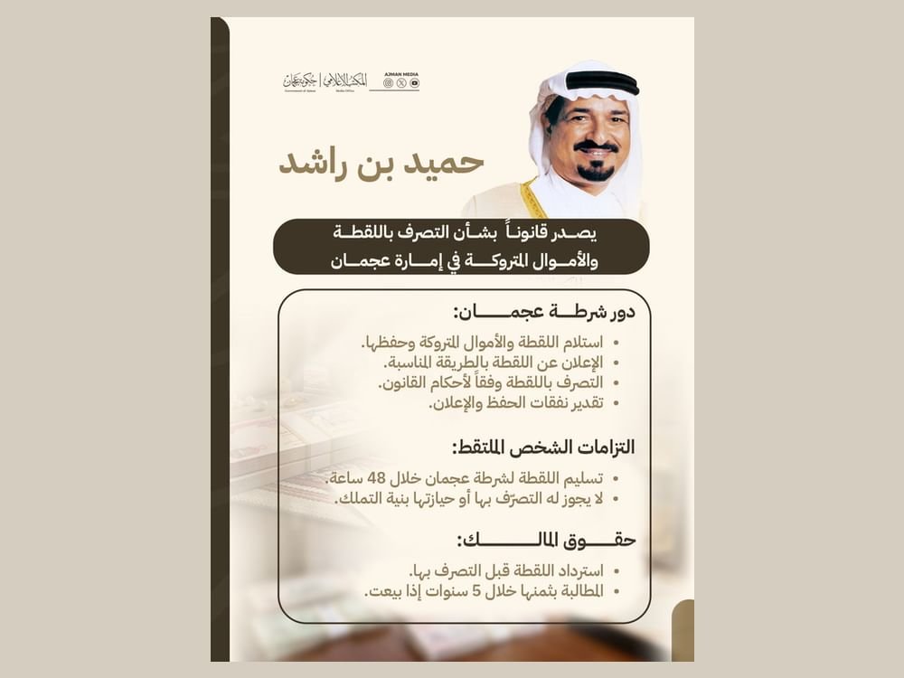 عجمان في 4 مارس 2026 أصدر صاحب السمو الشيخ حميد بن راشد النعيمي عضو المجلس الأعلى حاكم عجمان، القانون رقم (2) لسنة 2026 بشأن التصرف باللقطة والأموال المتروكة في إمارة عجمان.
