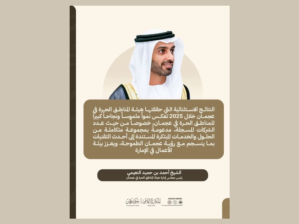 عجمان في 10 مارس 2026 سجلت هيئة المناطق الحرة في عجمان نتائج مالية وتشغيلية قياسية خلال عام 2025، محققة قفزة استثنائية وغير مسبوقة في عدد الشركات المسجلة بزيادة بلغت 216% مقارنة بعام 2024.